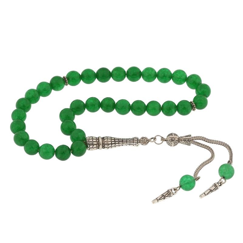 Yeşil Yeşim Taşı: En yaygın olanıdır. Sinir sistemine çok sakinleştirir. Yeşil renk, yaşamı ve büyümeyi temsil eder. Tutkuların yapıcı bir şekilde yapılmasına yardımcı olarak aşk ifadelerini kolaylaştırır. Asya ülkelerinde en saygın yere sahip olan onur taşı olarak kabul edilir. Yeşim taşının kalp, bağışıklık sistemi, dalak, böbrekler, sinir sistemi, timus ve saç için çok faydalı olduğu bilinmektedir. Tesbih el emeği ile üretilmiştir. Gümüş ve değerli taşlar nedeniyle belirtilen ürün ağırlığında ± %10 sapma olabilmektedir.