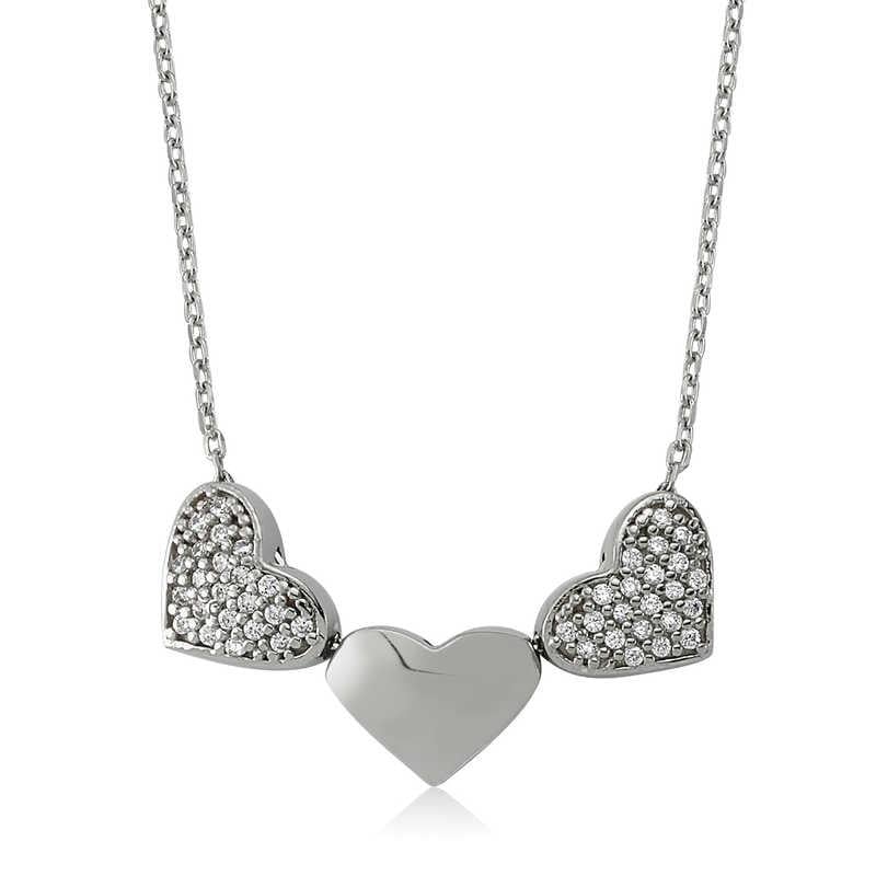 Kalp deseniyle aşkı ifade eden gümüş üç kalpli bayan kolye ile sevginiz, sevdiğiniz kadının teninde hayat bulsun. Genç sevgililerin özel günlerde seçebileceği üç kalpli bayan kolye modeli ile sevdiğinizin boynunu aşkla süsleyin. Sizin olduğu kadar sevdiklerinizin de keyifle takacağı bu kolye en güzel hediyelerden biri olacaktır. Üç kalpli bayan kolye 925 ayar gümüşten imal edilmiştir. Gümüş üzerine rodyum kaplama yapılmıştır. Rodyum kaplama yapılan gümüş bayan kolye modelleri parlaklığını uzun süre muhafaza eder ve oksitlenmesi gecikir. Kolye üzerinde bulunan taşlar zirkondur. Gümüş olan zincir boyu ortalama 45 cm\"dir. Tüm bayan kolye modellerinde olduğu gibi gümüş üç kalpli bayan kolye modeli de el emeği ile üretilmiştir. Gümüş ve değerli taşlar nedeniyle belirtilen ürün ağırlığında ± %10 sapma olabilmektedir.