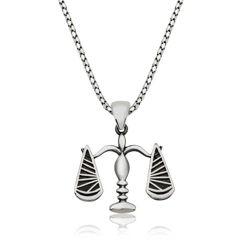 “Terazi” adaleti ve hakların dengeli şekilde dağıtılmasını sembolize eder. Adalet terazisi kolye; 925 ayar gümüşten imal edilmiştir. Gümüş üzerine oksit kaplama yapılmıştır. Oksit kaplama gümüşe eskitme görüntüsü verir. Zincir uzunluğu ortalama 55 cm\"dr. Tüm kolyelerde olduğu gibi bu gümüş adalet terazisi kolye modeli de tamamen el emeği ile üretilmiştir.
