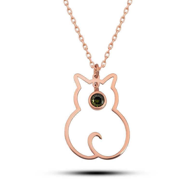 Her bir doğum taşı, belli bir ayla özdeşleşmiştir. Ağustos ayı doğum taşı Peridottur. Onur, koruma duygusu ve saflığı sembolize eder. Ayrıca sabır ve güven duygularını geliştirir. Sertlik derecesi 6,5 ile 7 arasındadır. Sarı ve yeşil tonlarını barındırır. Mısırlılar tarafından güneşin mücevheri olarak anılmaktadır. Taşın özelliği gece karanlığında da parlaması ve koyu yeşil bir renge bürünmesidir. Peridot refahı ve rahatlığı simgeler. Evlerimizin sevimli neşe kaynağı kediler, temiz olmalarının yanı sıra masumiyetin simgesidir. Asil ve mantıklı bir kişiliğe, mükemmel sezgilere ve akılcı bir duyarlılığa sahiptirler. Özel günlerin en tercih edilen hediye seçeneklerinden olan gümüş takılar, sevdiklerini mutlu etmek ve onlara her an yanlarında taşıyabilecekleri bir hediye vermek isteyenler için tasarlandı. Masumiyetin simgesi olan kedi figürlü gümüş kolye modelini kız kardeşinize, sevgilinize ya da arkadaşlarınıza armağan edebilirsiniz. Peridot taşlı kedi kadın kolye modeli 925 ayar gümüşten imal edilmiştir. Gümüş üzerine rose kaplama yapılmıştır. Rose kaplama yapılan gümüş kedi kolye modelleri parlaklığını uzun süre muhafaza eder ve oksitlenmesi gecikir. Kolye üzerinde bulunan tüm taş Peridottur. Gümüş olan zincir boyu ortalama 45 cm\"dir. Gümüş kadın kedi kolye diğer tüm gümüş kadın kolye modellerinde olduğu gibi el emeği ile üretilmiştir. Gümüş ve değerli taşlar nedeniyle belirtilen ortalama ürün ağırlığında ± %10 sapma olabilmektedir.