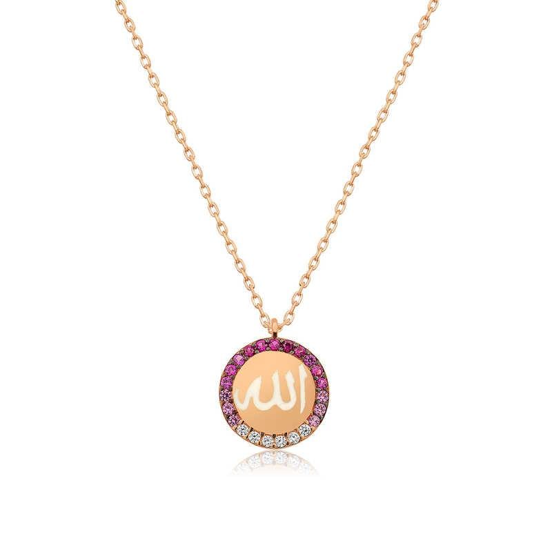 99 güzel isminden birincisi olan Allah yazılı kolyemiz ile göz alıcı şıklığınızı tamamlayın. Bu güzel kolye modelimiz 925 ayar gümüşten imal edilmiştir. Gümüş üzerine rose kaplama yapılmıştır.Rose kaplama yapılan gümüş bayan kolye modellerimiz parlaklığını uzun süre muhafaza eder, oksitlenmesi gecikir. Bu Allah yazılı kolyenin zincir uzunluğu ortalama 45 cm’dir. Tüm bayan kolye modellerimizde olduğu gibi Allah yazılı gümüş bayan kolye de el emeği ile üretilmiştir ve değerli taşlar nedeniyle ürün ağırlığında ± %10 sapma olabilmektedir.