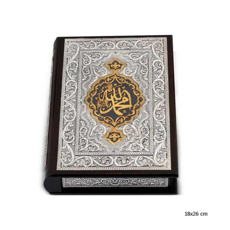 Kur\"an-ı Kerim ve Kuran Kabı ceviz rengi ahşap üzerine 925 ayar gümüş kaplamadır.