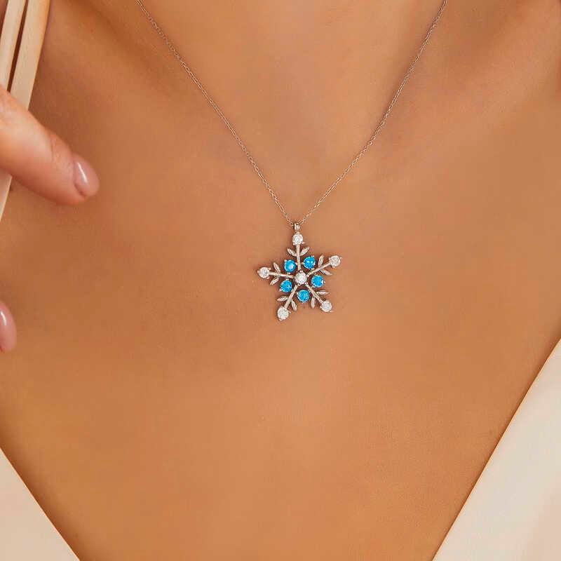 Kadınların ışıltısı, berraklığı kar tanesine benzetilip özel olarak tasarlanmıştır. Kar tanelerinin her birinin kadınlar gibi eşsiz ve ayrı kıymette olması onları özel kılan bir diğer özelliktir. Asilliği her dönemde dikkat çekmeyi başarmıştır. Bunun yanında insanların tıpkı kar taneleri gibi birbirlerine zarar vermeden de mutlu bir şekilde yaşayabileceklerini sembolize etmektedir. Bu şık kolye; doğum günü hediyesi, sevgililer günü hediyesi veya annelere hediye olarak özel günlerde tercih edilebilecek mükemmel bir seçenektir. Kolye, 925 ayar gümüşten imal edilmiştir. Gümüş üzerine rodyum kaplama yapılmıştır. Rodyum kaplama yapılan gümüş kadın kolye modelleri parlaklığını uzun süre muhafaza eder, oksitlenmesi gecikir. Zincir boyu ortalama 45 cm\"dir. Tüm gümüş kadın kolye modellerinde olduğu gibi bu gümüş Aquamarine taşlı kar tanesi kadın kolye de tamamı el emeği ile üretilmiştir. Gümüş ve değerli taşlar nedeniyle belirtilen ortalama ürün ağırlığında ± %10 sapma olabilmektedir.