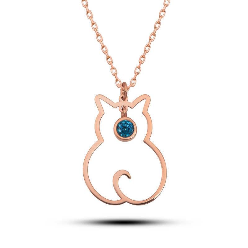 Her bir doğum taşı, belli bir ayla özdeşleşmiştir. Turkuaz aralık ayının burç taşıdır. Rengi mavi-yeşildir. Şans taşı olarak bilinen turkuazın bir diğer ismi de firuze taşıdır. Nazara karşı iyi geldiğine inanılan taş eşsiz rengi nedeniyle oldukça binlerce yıldır takı ve süs eşyası olarak kullanılmaktadır. Bilinci geliştirdiğine inanılan taşın tansiyona ve kalp hastalıklarına iyi geldiği söylenmektedir. Ayrıca konuşma ve yazı yoluyla ifade gücünü arttırdığına inanılmaktadır. Evlerimizin sevimli neşe kaynağı kediler, temiz olmalarının yanı sıra masumiyetin simgesidir. Asil ve mantıklı bir kişiliğe, mükemmel sezgilere ve akılcı bir duyarlılığa sahiptirler. Özel günlerin en tercih edilen hediye seçeneklerinden olan gümüş takılar, sevdiklerini mutlu etmek ve onlara her an yanlarında taşıyabilecekleri bir hediye vermek isteyenler için tasarlandı. Masumiyetin simgesi olan kedi figürlü gümüş kolye modelini kız kardeşinize, sevgilinize ya da arkadaşlarınıza armağan edebilirsiniz. Turkuaz taşlı kedi kadın kolye modeli 925 ayar gümüşten imal edilmiştir. Gümüş üzerine rose kaplama yapılmıştır. Rose kaplama yapılan gümüş kedi kolye modelleri parlaklığını uzun süre muhafaza eder ve oksitlenmesi gecikir. Kolye üzerinde bulunan tüm taş turkuazdır. Gümüş olan zincir boyu ortalama 45 cm\"dir. Gümüş kadın kedi kolye diğer tüm gümüş kadın kolye modellerinde olduğu gibi el emeği ile üretilmiştir. Gümüş ve değerli taşlar nedeniyle belirtilen ortalama ürün ağırlığında ± %10 sapma olabilmektedir.