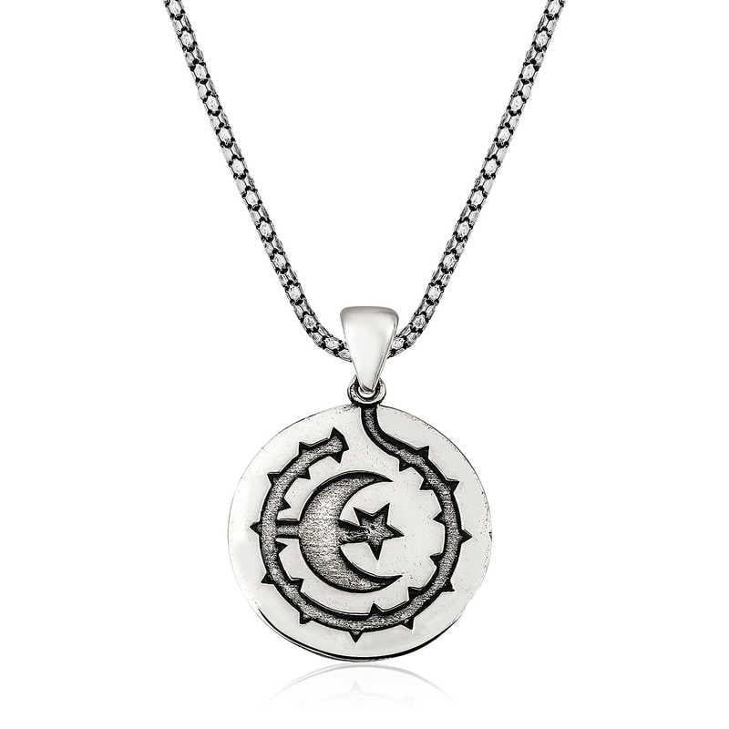 Türk Bayrağının rengini şehitlerin kanından ilhamını da kan gölüne yansıyan ay ve yıldızdan aldığını biliyoruz. Bayrağın taşıdığı kutsal anlamı teninizde taşımak ve sevdiklerinizle paylaşmak için kaçırılmayacak bir fırsat. Bu şık kolye modeli 925 ayar gümüşten imal edilmiştir. Gümüş üzerine oksit kaplama yapılmıştır. Oksit kaplama yapılan gümüş kolye modelleri eskitme bir görünüme sahiptir. Tüm ay yıldız kolye modellerinde olduğu gibi gümüş ay yıldız erkek kolye modeli de el emeği ile üretilmiştir. Gümüş ve değerli taşlar nedeniyle belirtilen ortalama ürün ağırlığında ± %10 sapma olabilmektedir.