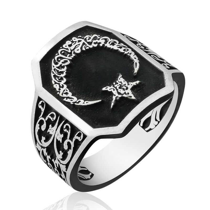 Hilal ve yıldız ya da ay-yıldız; hilal ve hilalin açık ucunda yer alan bir yıldız şeklinden oluşan antik sembol. Bu sembolün kullanıldığı bayraklara çoğunlukla Akdeniz civarında, Orta Doğu ve Orta Asya\"da rastlanır. Günümüzde çoğunlukla İslam ülkelerinin bayraklarında kullanılan bir sembol olarak bilinmektedir. Ay- Yıldız simgesi, Türk Bayrağı dahil bir çok bayrakta yer almaktadır. Ay ya da Hilâl, İslâm dini ile özdeşleşmesine rağmen, İslâm öncesi dönemlerde de kullanılmıştır. Ay- Yıldız ve Güneş motifleri, Asyalı Türk- Moğol halklarının evren tasarımı hakkında bilgiler sunar. Fakat Ay ile Yıldız’ın birlikte tasvir edildiği ilk belgeler Mezopotamya’da bugünkü Güney Irak’taki Sümer şehirlerinde ortaya çıkmıştır. Tarihte bariz şekilde hilâlden oluşan Ay-Yıldız motifini ilk kez Sümerler kullanmıştır. Sümerler, İÖ. 3000’de Güney Irak’ta tarihin ilk devletini kurmuşlar ve bugünkü medeniyetin inşasında çok büyük adım atmışlardı. Sümer dili Türkçe’ye oldukça yakın bir dildi. İnançları da Türkler’e büyük ölçüde benzer bir yapıdaydı. Sümer Ay Tanrısı “Nana- Suen” ve Güneş Tanrısı “Utu” veya Tanrıça İnana’nın sembolleri bir arada gösterilerek ilk Hilâl-Yıldız ikilemesi yapılmış oldu. Bu motif bazen taş kabartmalarda, bazen mühürlerde bazen de kil tabletlerde işlenmiş ve günümüze kadar ulaşmıştır. Bu şık yüzüğü; doğum günü hediyesi, sevgililer günü hediyesi olarak özel günlerde tercih edebilirsiniz. Gümüş ay yıldız erkek yüzük 925 ayar gümüşten imal edilmiştir. Gümüş üzerine oksit kaplama yapılmıştır. Oksit kaplama yapılan gümüş yüzükler eskitilmiş görünme sahip olurlar. Gümüş ve değerli taşlar nedeniyle belirtilen ortalama ürün ağırlığında ± %10 sapma olabilmektedir.