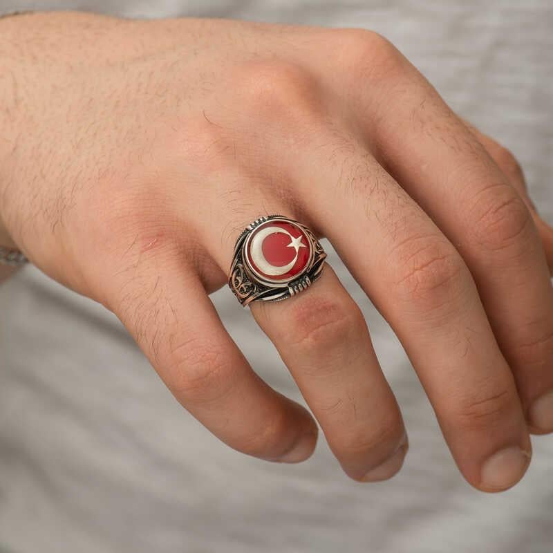 Hilal ve yıldız ya da ay-yıldız; hilal ve hilalin açık ucunda yer alan bir yıldız şeklinden oluşan antik sembol. Bu sembolün kullanıldığı bayraklara çoğunlukla Akdeniz civarında, Orta Doğu ve Orta Asya\"da rastlanır. Günümüzde çoğunlukla İslam ülkelerinin bayraklarında kullanılan bir sembol olarak bilinmektedir. Ay- Yıldız simgesi, Türk Bayrağı dahil bir çok bayrakta yer almaktadır. Ay ya da Hilâl, İslâm dini ile özdeşleşmesine rağmen, İslâm öncesi dönemlerde de kullanılmıştır. Ay- Yıldız ve Güneş motifleri, Asyalı Türk- Moğol halklarının evren tasarımı hakkında bilgiler sunar. Fakat Ay ile Yıldız’ın birlikte tasvir edildiği ilk belgeler Mezopotamya’da bugünkü Güney Irak’taki Sümer şehirlerinde ortaya çıkmıştır. Tarihte bariz şekilde hilâlden oluşan Ay-Yıldız motifini ilk kez Sümerler kullanmıştır. Sümerler, İÖ. 3000’de Güney Irak’ta tarihin ilk devletini kurmuşlar ve bugünkü medeniyetin inşasında çok büyük adım atmışlardı. Sümer dili Türkçe’ye oldukça yakın bir dildi. İnançları da Türkler’e büyük ölçüde benzer bir yapıdaydı. Sümer Ay Tanrısı “Nana- Suen” ve Güneş Tanrısı “Utu” veya Tanrıça İnana’nın sembolleri bir arada gösterilerek ilk Hilâl-Yıldız ikilemesi yapılmış oldu. Bu motif bazen taş kabartmalarda, bazen mühürlerde bazen de kil tabletlerde işlenmiş ve günümüze kadar ulaşmıştır. Bu şık yüzüğü; doğum günü hediyesi, sevgililer günü hediyesi olarak özel günlerde tercih edebilirsiniz. Gümüş ay yıldız erkek yüzük 925 ayar gümüşten imal edilmiştir. Gümüş üzerine oksit kaplama yapılmıştır. Oksit kaplama yapılan gümüş yüzükler eskitilmiş görünme sahip olurlar. Gümüş ve değerli taşlar nedeniyle belirtilen ortalama ürün ağırlığında ± %10 sapma olabilmektedir.