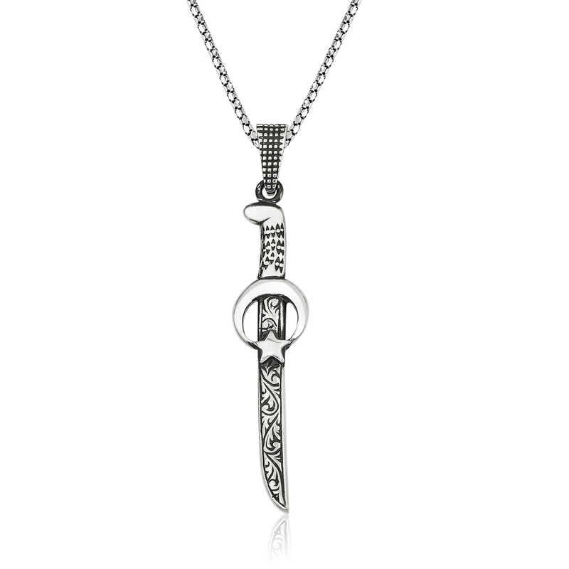 Kılıç tarih boyunca bir çok uygarlık tarafından kullanılmış silahların icadından önce insan oğlunun iktidar gücünü ortaya koyup uygulayabilmesi için kullandığı çeşitli boyutlarda olabilen, keskin kenarlı, sivri uçlu bir silahtır. Kılıcın boyutu tarihler boyunca, farklı uluslarda, farklı boyutlarda olmuştur. Türkler Orta Asya’ya göç edince kılıç yapım merkezleri kurarlar. Kılıç geleneği Selçuklular ve Osmanlı dönemlerinde devam eder. Anadolu kılıçlarını batının kılıçlarından ayıran özellik; eğri, çok su verilmiş ve eğriliklerinden dolayı çok rahat kullanılabilir olmalarıydı. Türkler kılıca, üzerine yemin edilebilecek derecede önem atfederken, demir ve onu eriten ateşin ruhsal bir yönü olduğunu savunmuşlardır. Yetenekli bileklerde kılıç harikalar yaratabilirdi ve Eski Türk uygarlıklarında süvariler, atları ve kılıçları ile gömülmek istemişlerdir. Kılıç, insanın zor bir maden olan demir üzerinde ateşle neler yapabileceğinin en güzel kanıtlarından biridir. Eğer eski zaman kahramanlıkları ilginizi çekiyorsa, yakın temasla mücadeleyi sahici buluyorsanız, sadece bir kılıç kolyeniz eksik demektir. Gümüş Ay Yıldız figürlü kılıç erkek kolye 925 ayar gümüşten imal edilmiştir. Gümüş üzerine eskitme görünüm kazandırmak için oksit kaplama yapılmıştır. Zincir boyu 55 cm\"dir. Gümüş ve değerli taşlar nedeniyle ürün ağırlığında ± %10 sapma olabilmektedir.