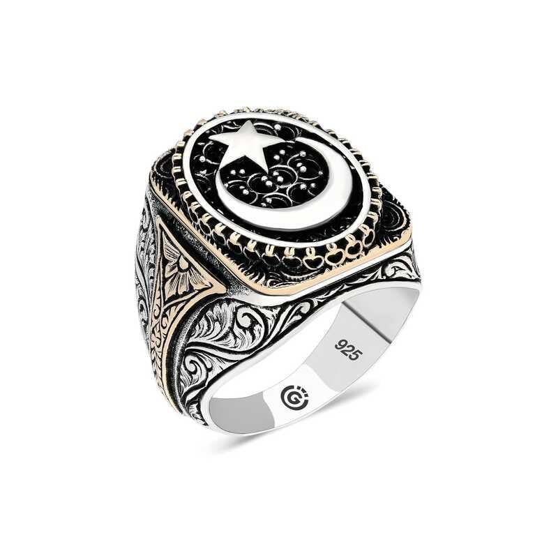 Gümüş Ay Yıldız Oval Erkek Yüzük