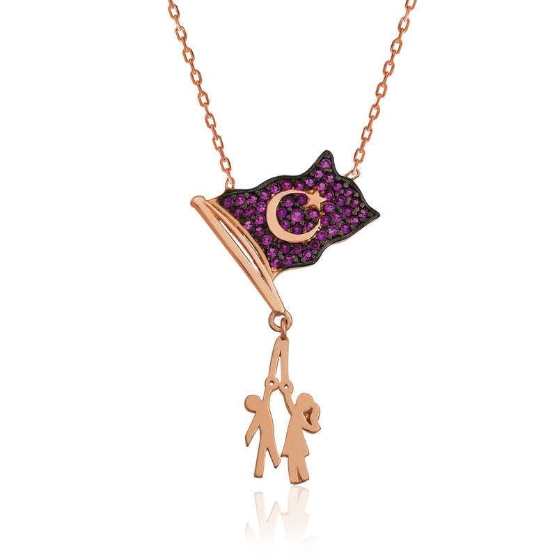 Bayrak; bir milletin varlığının ve bağımsızlığının sembolü, tarihinin hatırasıdır. Bayrağın değeri temsil ettiği milletin kıymeti ile ölçülür. Devletin hakimiyetini, bağımsızlığını ve şerefini temsil ettiği için bayrağa saygı gösterilir. Kırmızı zemin üzerinde hilal ve yıldız bulunan bayrağa efsanevi bir anlam katan inanış vardır. Osmanlıların 1448\"de, düşmanlarını ağır bir yenilgiye uğrattığı Kosova savaşından sonraki gece; savaş alanında oluşmuş kan gölünün üzerinde gökyüzünden yansıyan hilal ve yıldız yan yana görünmüştür. Böylece sultan II Murad bu simgeyi devlet bayrakları arasında kullanmaya başlamıştır. Sizde sevdiklerinize gümüş türk bayrağı tutan çocuklar kolyeyi armağan edebilir onları sevindirebilirsiniz. Bayrak tutan çocuklar kolye modeli 925 ayar gümüşten imal edilmiştir. Gümüş üzerine rose kaplama yapılmıştır. Rose kaplama yapılan gümüş kolye modelleri parlaklığını uzun süre muhafaza eder ve oksitlenmesi gecikir. Gümüş kolyenin ortalama boyu 45 cm\"dir. Tüm kolye modellerinde olduğu gibi gümüş bayrak tutan çocuklar kolye modeli de el emeği ile üretilmiştir. Gümüş ve değerli taşlar nedeniyle belirtilen ortalama ürün ağırlığında ± %10 sapma olabilmektedir.