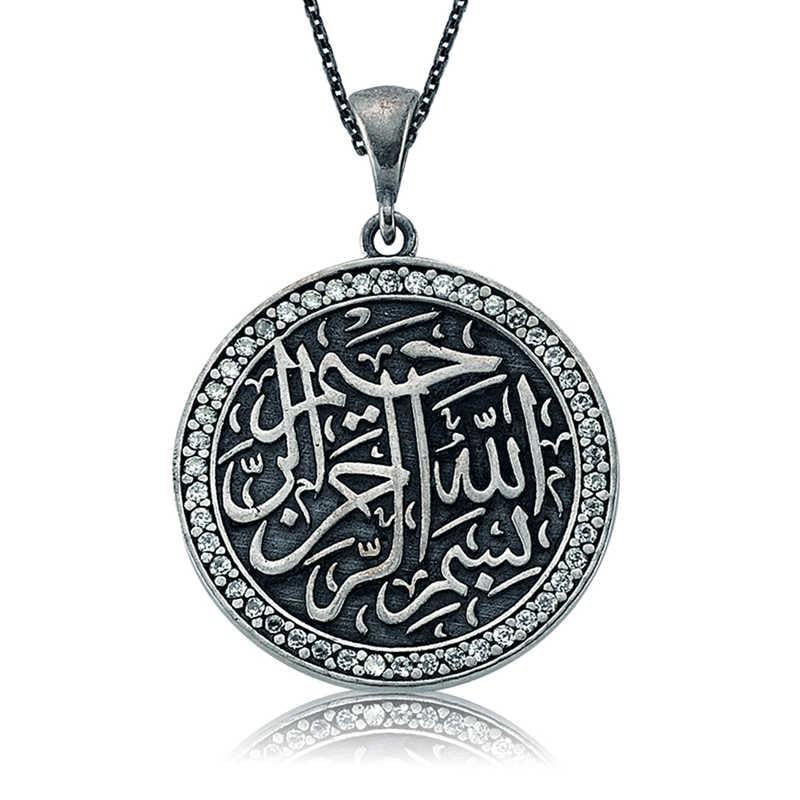 "Besmele" "Bismillâhirrahmânirrahîm"in kısaltılmış şeklidir. Hayırlı bir işe başlarken, Allah\"ın ismini anarak işe başlamak mânâsına gelir. Besmele-i Şerif bayan kolye modeli sizler için tasarlandı. Bu şık kolye 925 ayar gümüşten imal edilmiştir. Gümüş üzerine oksit kaplama yapılmıştır. Oksit kaplama yapılan bayan kolyeler parlaklığını uzun süre muhafaza eder. Tüm gümüş bayan kolyelerde olduğu gibi gümüş besmele-i şerif bayan kolye modeli de el emeği ile üretilmiştir. Gümüş ve değerli taşlar nedeniyle belirtilen ortalama ürün ağırlığında ± %10 sapma olabilmektedir.