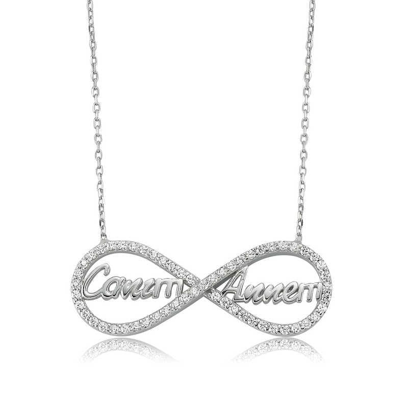 Hayatta en değerli varlığımız canım annemiz için en güzel hediyeyi vermek istemeniz çok doğaldır. Çünkü annemiz bizim için hayattaki en önemli varlıktır. Annenize duyduğunuz sonsuz sevginizi hissettirebileceğiniz bu özel tasarım gümüş canım annem yazılı sonsuzluk bayan kolye modeli ile hem onu çok mutlu edeceksiniz, hem de onu güzel bir hediyeyle taçlandırmış olacaksınız. Bu şık kolye 925 ayar gümüşten imal edilmiştir. Gümüş üzerine rodyum kaplama yapılmıştır. Rodyum kaplama yapılan gümüş anne çocuk kolye modelleri parlaklığını uzun süre muhafaza eder ve oksitlenmesi gecikir. Kolye üzerinde bulunan beyaz taşlar zirkondur. Gümüş kolyelerimizin tamamı el emeği ile üretilmiştir ve gümüş ve değerli taşlar nedeniyle belirtilen ortalama ürün ağırlığında ± %10 sapma olabilmektedir.