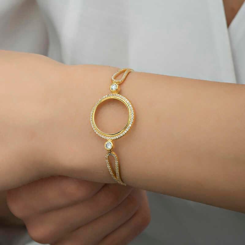 Yuvarlak form deseniyle şıklığı ifade eden gümüş çeyrek takılabilen altın kadın bileklik modeli ile sevginiz, sevdiğiniz kadının teninde hayat bulsun. Genç sevgililerin ve kendini genç hissedenlerin özel günlerde de seçebileceği bu kadın bileklik modeli ile sevdiğinizin bileğini aşkla süsleyin. Sizin olduğu kadar sevdiklerinizin de keyifle takacağı kadın bileklik sevdiğinize en güzel hediyelerden biri olacaktır. Bu kadın bileklik modeli 925 ayar gümüşten imal edilmiştir. Gümüş üzerine altın kaplama yapılmıştır. Altın kaplama yapılan gümüş kadın bileklik modelleri parlaklığını uzun süre muhafaza eder ve oksitlenmesi gecikir. Bileklik üzerinde bulunan beyaz taşlar zirkondur. Tüm kadın bileklik modellerinde olduğu gibi gümüş kadın bileklik modeli de el emeği ile üretilmiştir. Gümüş ve değerli taşlar nedeniyle belirtilen ortalama ürün ağırlığında ± %10 sapma olabilmektedir.