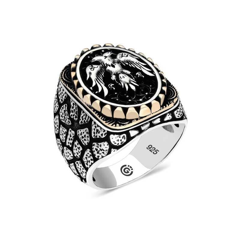 Gümüş üzerindeki çift başlı kartal oval erkek yüzük modeli günün her anında kullanabileceğiniz şık bir aksesuardır. Bu yüzüğü; kendinize ya da sevdiklerinize doğum gününde, babalar gününde ya da özel günlerde hediye edebilirsiniz. Çift başlı kartal oval erkek yüzük modeli 925 ayar gümüşten imal edilmiştir. Gümüş üzerine oksit kaplama yapılmıştır. Oksit kaplama yapılan gümüş erkek yüzük modelleri parlaklığını uzun süre muhafaza eder. Tüm erkek yüzüklerde olduğu gibi gümüş çift başlı oval erkek yüzük modeli de el emeği ile üretilmiştir. Gümüş ve değerli taşlar nedeniyle belirtilen ortalama ürün ağırlığında ± %10 sapma olabilmektedir.​