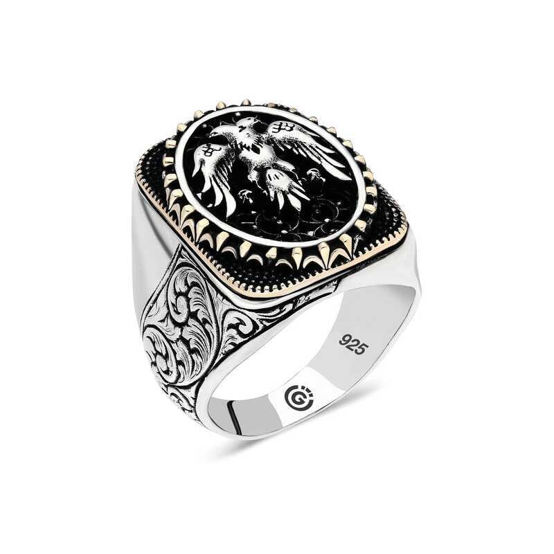 Gümüş üzerindeki çift başlı kartal oval erkek yüzük modeli günün her anında kullanabileceğiniz şık bir aksesuardır. Bu yüzüğü; kendinize ya da sevdiklerinize doğum gününde, babalar gününde ya da özel günlerde hediye edebilirsiniz. Çift başlı kartal oval erkek yüzük modeli 925 ayar gümüşten imal edilmiştir. Gümüş üzerine oksit kaplama yapılmıştır. Oksit kaplama yapılan gümüş erkek yüzük modelleri parlaklığını uzun süre muhafaza eder. Tüm erkek yüzüklerde olduğu gibi gümüş çift başlı oval erkek yüzük modeli de el emeği ile üretilmiştir. Gümüş ve değerli taşlar nedeniyle belirtilen ortalama ürün ağırlığında ± %10 sapma olabilmektedir.​