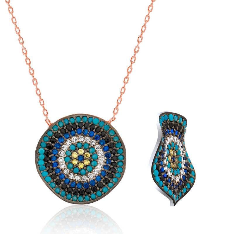 Nazar boncuğunu insanlar uzun yıllardan beri kötü bakıştan korunmak için kullanmışlardır. Kötü bakışların insanlar üzerinde olumsuz etki oluşturmasına karşı bir önlemdir nazar boncuğu… Bu sebeptendir ki insanlar sevdiklerini korumak için nazar boncuğu takmaktadır. Bu nazar kolye de şıklığı ve zarafeti yansıtıyor. Her dönem sevilen ve şıklığından ödün vermeyen bu modeli ; doğum günü hediyesi, sevgililer günü hediyesi veya annelere hediye olarak özel günlerde tercih edebilirsiniz. Gümüş dalgalı nazar bayan kolye, 925 ayar gümüşten imal edilmiştir. Gümüş kolye üzerine rose kaplama yapılmıştır. Rose kaplama yapılan bayan kolyeler parlaklığını uzun süre muhafaza eder, gümüş rengini pembe renge dönüştürür ve oksitlenmeyi geciktirir. Zincir boyu ortalama 45 cm\"dir. Kolye üzerinde bulunan taşlar firuze ve zirkondur. Tüm gümüş bayan kolye modellerinde olduğu gibi bu gümüş dalgalı nazar bayan kolye modeli de tamamı el emeği ile üretilmiştir. Gümüş ve değerli taşlar nedeniyle belirtilen ortalama ürün ağırlığında ± %10 sapma olabilmektedir.