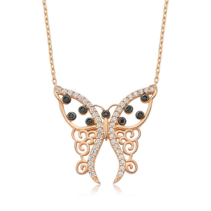 Özgürlüğü masumiyeti ve saflığı simgeleyen kelebekler, tertemiz sevginin ve aşkın ifadesidir. Sizin olduğu kadar sevdiklerinizin de keyifle takacağı yeşil kelebek bayan kolye en güzel hediyelerden biri olacaktır. Kolye 925 ayar gümüşten imal edilmiştir. Gümüş üzerine rose altın kaplama yapılmıştır. Rose altın kaplama yapılan gümüş bayan kolyeler parlaklığını uzun süre muhafaza eder, gümüşü pembe rengine dönüştürür ve oksitlenmeyi geciktirir. Gümüş olan zincir boyu ortalama 45 cm\"dir. Tüm gümüş bayan kolyelerde olduğu gibi gümüş desenli kelebek bayan kolye modeli de el emeği ile üretilmiştir. Gümüş ve değerli taşlar nedeniyle belirtilen ortalama ürün ağırlığında ± %10 sapma olabilmektedir.