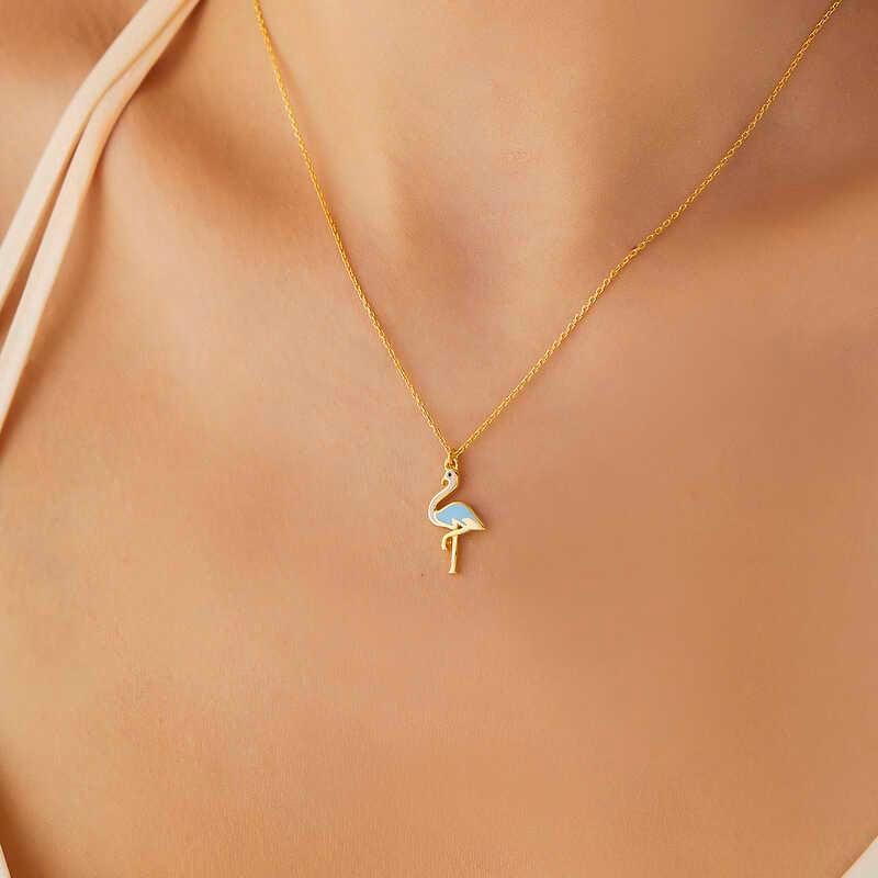 Doğasının gereği taşıdığı renklerle dövmelerde kullanılan flamingolar, zarafet ve güzelliğin sembolüdür. Bu anlamlar onun için ortak olarak kullanılan tanımlardır ancak kuş olmalarının getirdiği manevi rehber, özgürlük, aşk ve asalet gibi anlamlara da gelmektedir. Bu sayede şık bir hediye seçeneğidir. Gümüş üzerine gold kaplama yapılmıştır. Gold kaplama yapılan gümüş kadın kolye modelleri parlaklığını uzun süre muhafaza eder, oksitlenmesi gecikir. Kolye ile birlikte gelen zincir tamamen gümüş olup 45 cm uzunluğundadır. Tüm gümüş kadın kolye modellerinde olduğu gibi gümüş kadın flamingo kolye modeli de tamamen el emeği üretilmiştir. Bu nedenle maden ve değerli taşlardan dolayı belirtilen ortalama ürün ağırlığında ± %10 sapma olabilmektedir.