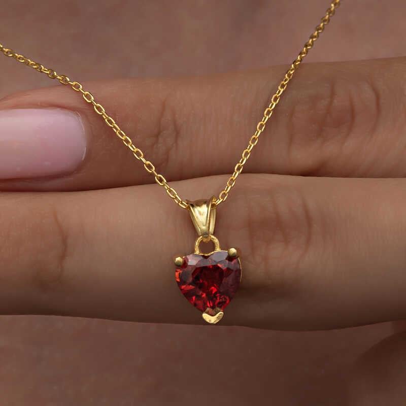 Gümüş Gold Kırmızı Taşlı Kalpli Kadın Kolye