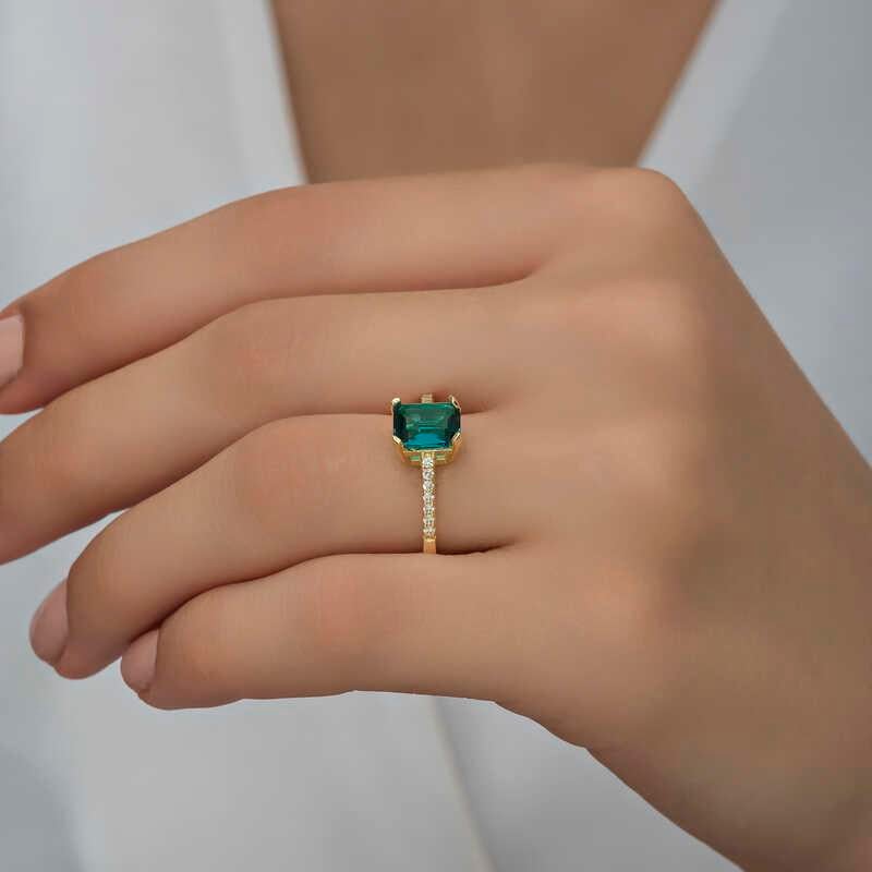 Gümüş Gold Yeşil Baget Taşlı Kadın Yüzük