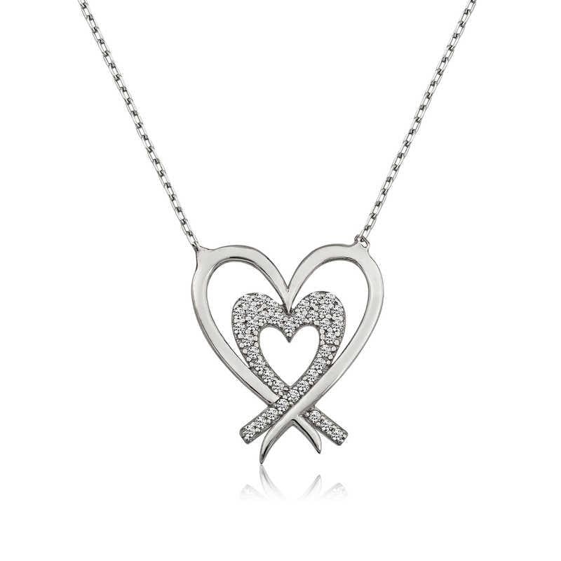 Kalp deseniyle aşkı ifade eden iki kalpli bayan kolye ile sevginiz, sevdiğiniz kadının teninde hayat bulsun. Biri sizin diğeri sevdiğiniz kişinin kalbini temsil eden bu şık kolye; 925 ayar gümüşten imal edilmiştir. Sizin olduğu kadar sevdiklerinizin de keyifle takacağı gümüş iki kalp bayan kolye; doğum günü hediyesi, sevgililer günü hediyesi veya annelere hediye olarak özel günlerde tercih edilebilecek mükemmel bir seçenektir. Gümüş üzerine rodyum kaplama yapılmıştır. Rodyum kaplama yapılan bayan kolye modelleri parlaklığını uzun süre muhafaza eder ve oksitlenmesi gecikir. Üzerinde bulunan taşlar zirkon\"dur. Tüm gümüş bayan kolyelerde olduğu gibi gümüş iki kalp bayan kolye de el emeği ile üretilmiştir. Gümüş ve değerli taşlar nedeniyle belirtilen ürün ağırlığında ± %10 sapma olabilmektedir.
