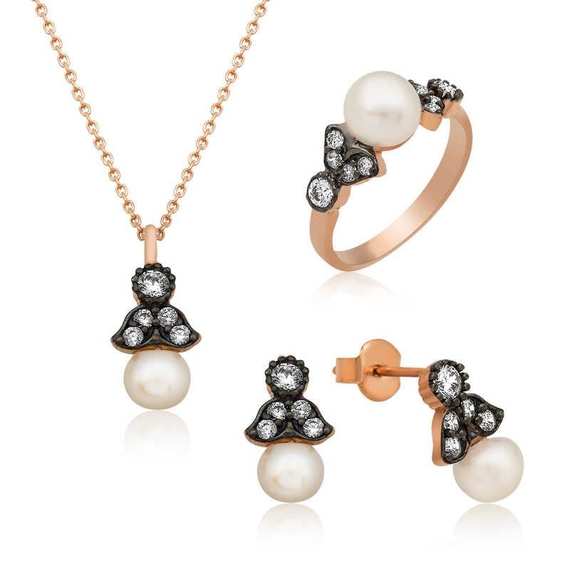 Modası hiçbir zaman geçmeyecek olan inci, günümüz takıları ile farklı stillerde yeniden yorumlanıyor.İnci ve zirkonun göz alıcı ışıltısı, sizi de saracak. Sizin olduğu kadar sevdiklerinizin de keyifle takacağı bu gümüş set, aynı zamanda sevginizi paylaşabileceğiniz en güzel hediyelerden biri olacaktır. 925 ayar gümüşten imal edilmiştir. Gümüş üzerine rose kaplama yapılmıştır. Rose kaplama yapılan ürünler bakır rengini alır ve parlaklığını uzun süre muhafaza eder, oksitlenmesi gecikir. Zincir boyu ortalama 45 cm\"dir. Üzerinde bulunan taşlar zirkon ve kültür incisidir. Gümüş setlerin tamamında olduğu gibi gümüş inci bayan set de el emeği ile üretilmiştir. Gümüş ve değerli taşlar nedeniyle belirtilen ortalama ürün ağırlığında ± %10 sapma olabilmektedir.