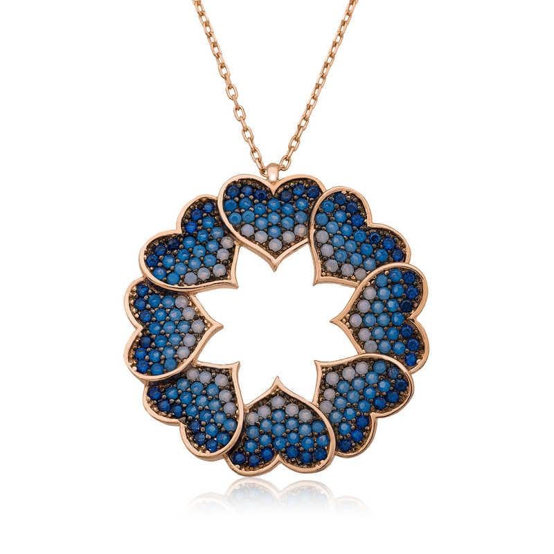 Aşkın ve sevginin simgesi kalpli bayan kolye ile sevdiğiniz kişiye hem anlamlı hem de güzel bir hediye verebilirsiniz. Dünyanın dört bir yanında herkesin birbirine sevgi sözcükleri söylediği sevgililer gününde siz de sevgilinize aşkınızı ilan eden bu kalp çemberi kolyeyi hediye edebilirsiniz. Gümüş kalp çemberi bayan kolye 925 ayar gümüşten imal edilmiştir. Gümüş üzerine rose altın kaplama yapılmıştır. Rose altın kaplama yapılan gümüş bayan kolye modelleri parlaklığını uzun süre muhafaza eder, gümüşe pembe rengi verir ve oksitlenmesi gecikir. Kolye üzerinde bulunan taşlar zirkondur. Gümüş olan zincir boyu ortalama 45 cm\"dir. Tüm gümüş bayan kolye modellerinde olduğu gibi gümüş kalp çemberi kolye modeli de el emeği ile üretilmiştir. Gümüş ve değerli taşlar nedeniyle belirtilen ürün ağırlığında ± %10 sapma olabilmektedir.