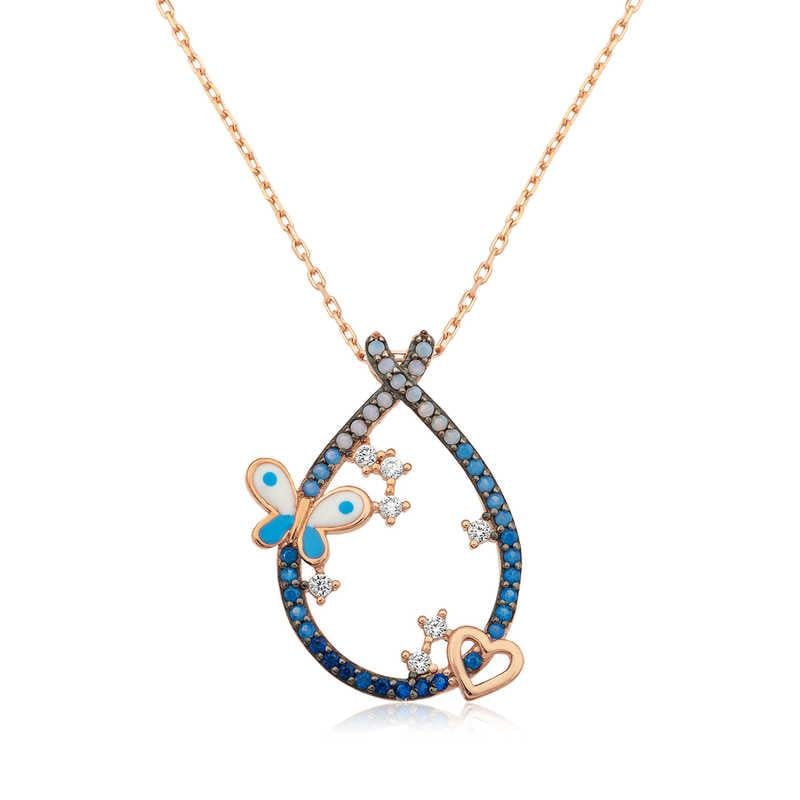 Gümüş Kalpli Ve Kelebekli Damla Kolye