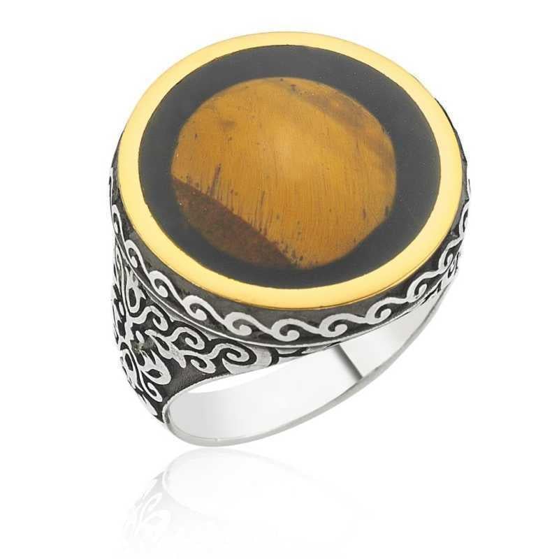 Kaplan gözü, Kristal Kuvars’ın bir alt türü olan Kalsedon grubuna bağlı bir değerli taştır. Adını, kaplanın gözlerine benzeyen kendine özgü renk tonlarından alır. Altınımsı ya da bal rengi olarak tanımlanan çizgisel tonları vardır. Yanardöner ve ipeğimsi görünüşü kaplan gözünü eşsiz kılan özelliklerinden biridir. “Sevgililerin taşı” olarak da tanımlanan kaplan gözü, duygulara hitap eden bir taştır. Değerli taşlar arasında, “koruyucu” özelliği ile en çok öne çıkanlardan biridir. Kullananın hareketlerine veya ruhsal durumuna göre renk değiştirmesi de bilinen özelliklerinden biridir. Bu şık yüzüğü; kendinize yada sevdiklerinize doğum gününde, babalar gününde yada özel günlerde tercih edebilirsiniz. Bu şık yüzük 925 ayar gümüşten imal edilmiştir. Gümüş üzerine oksit kaplama yapılmıştır. Oksit kaplama yapılan yüzükler parlaklığını uzun süre muhafaza eder. Tüm erkek yüzüklerde olduğu gibi gümüş kaplan gözü erkek yüzük de el emeği ile üretilmiştir. Gümüş ve değerli taşlar nedeniyle ürün ağırlığında ± %10 sapma olabilmektedir.