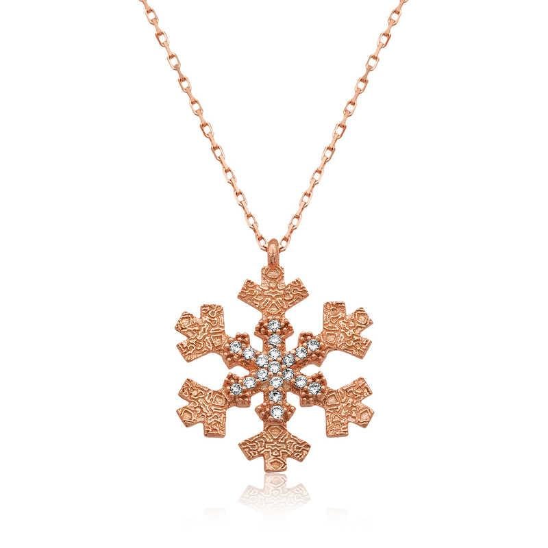 Doğanın mucizevi kristalleri her ne kadar şekilleri, özellikleri ve görünüşleri birbirine çok yakın olsa da, aslında her bir kar tanesinin eşsiz olduğu biliniyor. Hiçbir kar tanesi bir diğerine benzemiyor, her kar tanesinden aslında sadece bir tane var… Sevdiğiniz kişiye hediye ettiğiniz kar tanesi kolye ile onun sizin için eşsiz ve biricik olduğunu sessizce dillendirmiş oluyorsunuz. Bu şık kolye modeli 925 ayar gümüşten imal edilmiştir. Gümüş üzerine rose altın kaplama yapılmıştır. Rose altın kaplama yapılan gümüş kolye modelleri parlaklığını uzun süre muhafaza eder. Sizlerde her zevke uygun kar tanesi kolye ile şıklığınıza ışıltı katın. Ürünlerimizin tamamı el emeği ile üretilmiştir. Gümüş ve değerli taşlar nedeniyle belirtilen ortalama ürün ağırlığında ± %10 sapma olabilmektedir.