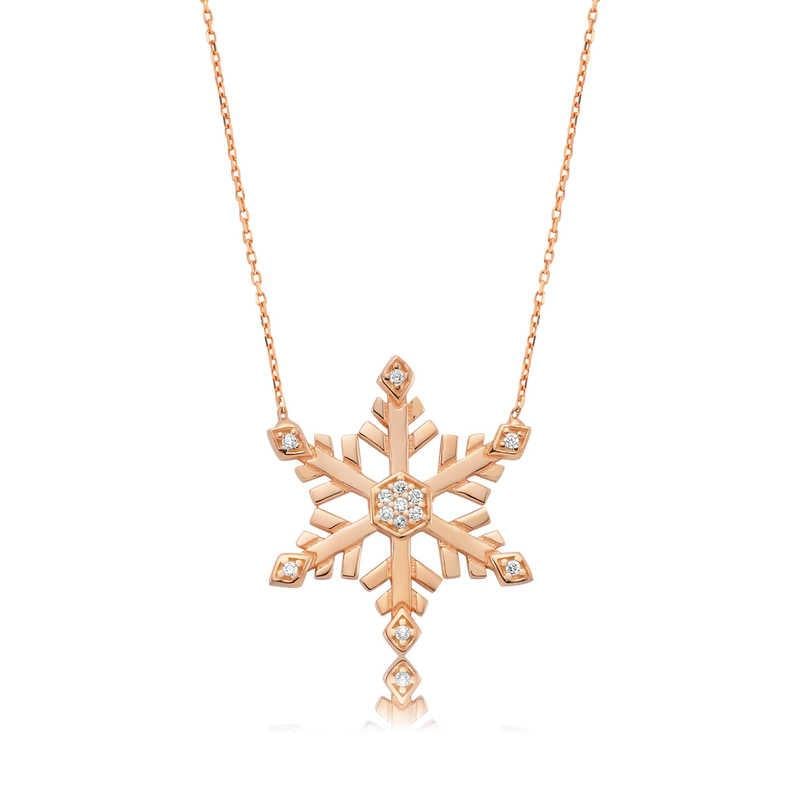 Bu harika tasarıma sahip kar tanesi bayan kolye 925 ayar gümüşten imal edilmiştir. Birçok kar kristal çeşidi olmasına rağmen, kar tanelerinin kristal yapıları birbirinin tıpa tıp aynısı değildir, her bir kar tanesi eşsizdir ve bir benzeri yoktur. Sevdiklerine eşsiz bir hediye vermek isteyen kişiler için, zirkon taşlarla süslenmiş bu kar tanesi kolye mükemmel anlamlar yüklü kaçırılmayacak bir hediye fırsatıdır. Bu kar tanesi kolye tasarımının üzerine rose altın kaplama yapılmıştır. Rose altın kaplama yapılan gümüş bayan kolye modelleri parlaklığını uzun süre muhafaza eder, oksitlenmesi gecikir. Gümüş bayan kolyenin üzerinde bulunan taşlar zirkondur. Ortalaması 45 cm olan gümüş bir zincir ile gönderilir. Tüm gümüş bayan kolye tasarımları ve modelleri el emeği ile üretilmiştir. Gümüş ve değerli taşlar nedeniyle belirtilen ürün ağırlığında ± %10 sapma olabilmektedir.