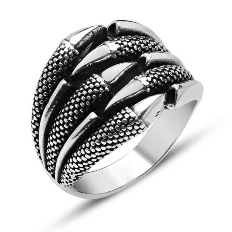 Kuşların kralı olan ve savaşmak üzere dünyaya inen kartal, özellikle savaşçı ve güçlü olmasıyla tanınır; bu yüzden pek çok ulusun sembolü olmuştur. Bu derin anlamdan esinlenerek oluşturulan kartal pençesi erkek yüzük modeli kendinize ya da sevdiklerinize doğum gününde, babalar gününde yada özel günlerde hediye edebilirsiniz. Bu şık erkek yüzük modeli 925 ayar gümüşten imal edilmiştir. Gümüş üzerine oksit kaplama yapılmıştır. Oksit kaplama yapılan yüzükler otantik bir görünüme kavuşur. Tüm erkek yüzük modellerinde olduğu gibi gümüş kartal pençesi erkek yüzük modeli de el emeği ile üretilmiştir. Gümüş ve değerli taşlar nedeniyle belirtilen ortalama ürün ağırlığında ± %10 sapma olabilmektedir.