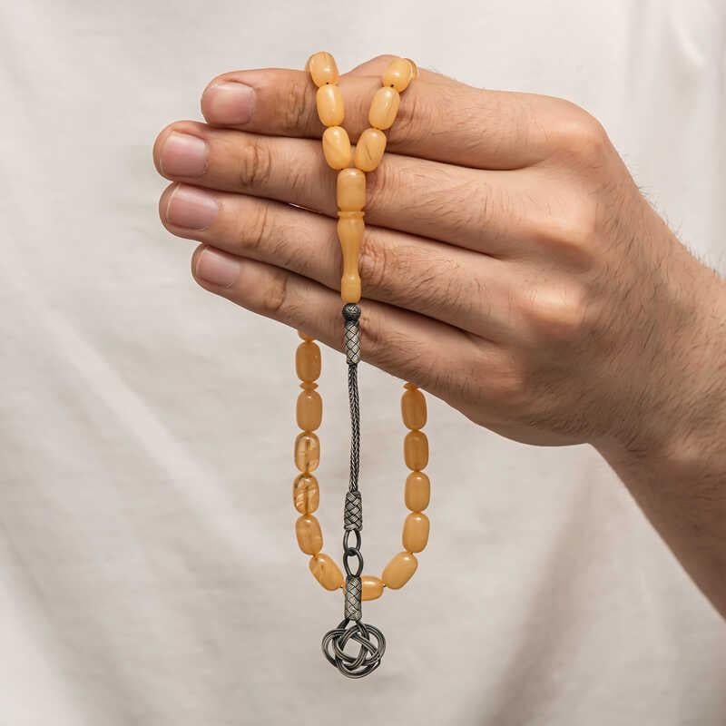 Kehribar, çam ağacı reçinesinin toprak altında uzun yıllar boyunca birikerek oluşan bir maddedir. Hemen hemen taş ile aynı sertliktedir fakat yoğunluğu düşüktür. Çam kokusu yayar. Oluşumu uzun zaman aldığından ve yapay olarak yapılamadığından değerli bir maddedir. Sıkma kehribar ise kehribar taşından farklı olarak onun özelliklerini taşıyan, görüntü itibariyle ona benzeyen fakat gerçek olmayan bir malzemedir. Ülkemizde ve dünyanın bir çok yerinde kehribar taşından çeşitli malzemeler üretilmiştir. Ülkemizde en yaygın olarak tesbih üretilmektedir. Kehribar tesbihler elde ısındıkça kehribar benzeri bir koku verir ve renk değiştirir. Bir çok rengi vardır. Hatta iki rengin birleşiminden oluşan kehribar tesbih modelleri de vardır. Genellikle gümüş püskül ile kullanılır veya sistemli olarak da kullanılabilir. Ülkemizin güzide tesbih ustaları bu malzemeyi sıklıkla işlemek suretiyle çeşitli sanat eserleri meydana getirirler. Bu tesbihler de koleksiyonerler tarafından alınıp satılmaktadır. Gümüş 1000 ayar kazaz püsküllü sıkma kehribar tesbih modeli de günlük hayatta kullanılabilecek çok şık bir tesbih çeşididir. Özel günlerin vazgeçilmez hediyesi sıkma kehribar tesbihler erkekler için doğum günü, sevgililer günü ve babalar günü gibi özel zamanlarda hediye olarak tercih edilebilir. Gümüş kazaz püsküllü sıkma kehribar tesbih modeli diğer kehribar tesbih modellerinde olduğu gibi tamamen el emeği ile imal edilmiştir.