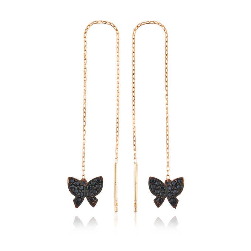 Özgürlüğü masumiyeti ve saflığı simgeleyen kelebekler, tertemiz sevginin ve aşkın ifadesidir. Bahar kelebekleri kolye anlam itibari ile aşkın küçük bir kıvılcım ile başladığı daha sonra büyük bir sabır ile büyüdüğü ve en sonunda ilan-ı aşkı ifade eder. Sizin olduğu kadar sevdiklerinizin de keyifle takacağı gümüş zincir kelebek bayan küpe; doğum günü hediyesi, sevgililer günü hediyesi veya annelere hediye olarak özel günlerde tercih edilebilecek mükemmel bir seçenektir. Küpe 925 ayar gümüşten imal edilmiştir. Gümüş üzerine rose kaplama yapılmıştır. Rose kaplama yapılan ürünler parlaklığını uzun süre muhafaza eder, gümüşe pembe rengini verir ve oksitlenmeyi geciktirir. Üzerinde bulunan siyah taşlar zirkondur. Tüm gümüş bayan küpelerde olduğu gibi gümüş kelebek zincir bayan küpe de el emeği ile üretilmiştir. Gümüş ve değerli taşlar nedeniyle belirtilen ürün ağırlığında ± %10 sapma olabilmektedir.