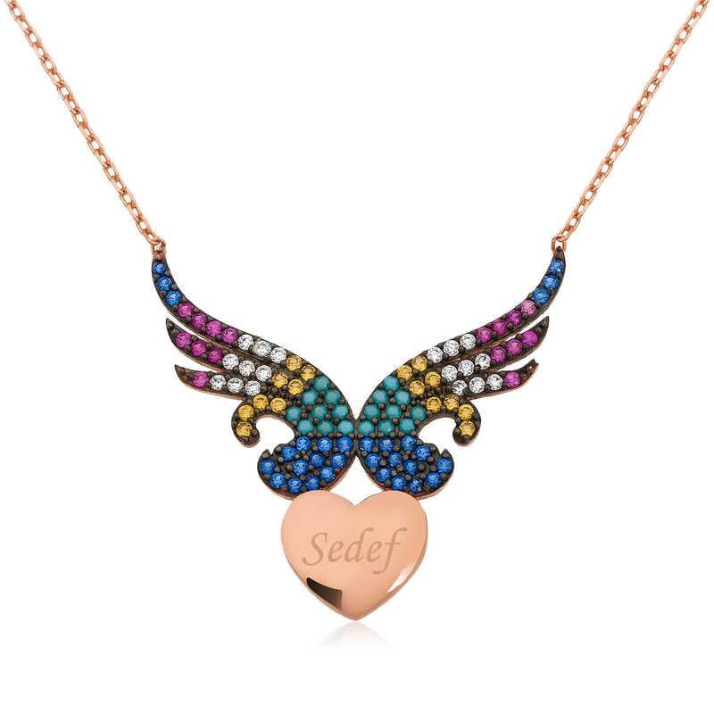 Gümüş Kişiye Özel İsimli Kanatlı Kalp Bayan Kolye