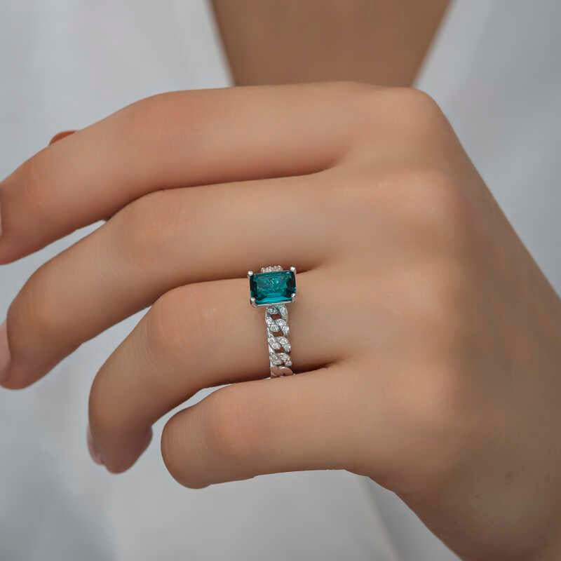 Gümüş Koyu Yeşil Baget Taşlı Kadın Yüzük