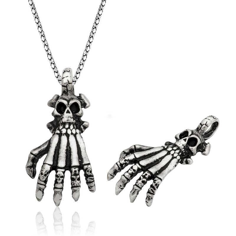 Kuru kafanın gizem ve ölüm anlamı vardır. Takılarda sıklıkla kullanılır. Bu şık kolye modelinin de esin kaynağı olmuştur. Kuru kafa erkek kolye modeli 925 ayar gümüşten imal edilmiştir. Kolye üzerine oksit kaplama yapılmıştır. Oksit kaplama yapılan gümüş takılar eskitme bir görünüme kavuşur. Tüm gümüş kolye modellerinde olduğu gibi gümüş kuru kafa el erkek kolye modeli de tamamen el emeği ile üretilmiştir. Gümüş zincir uzunluğu 55 cm\"dir. Gümüş ve değerli taşlar nedeniyle belirtilen ortalama ürün ağırlığında ± %10 sapma olabilmektedir.