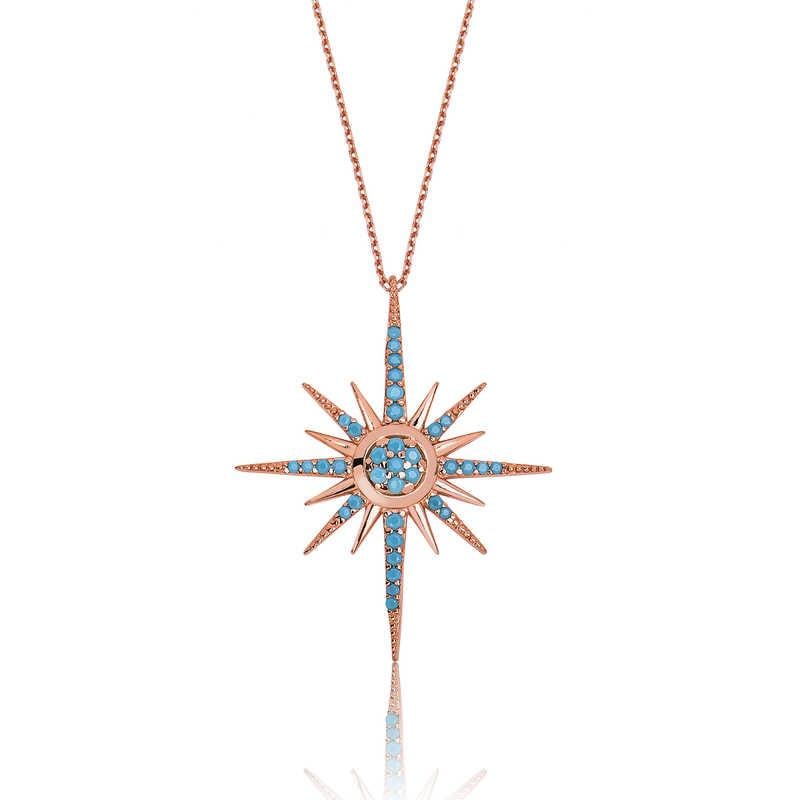 Kutup yıldızı milyonlarca yıldızdan sadece biridir ama aydan en çok etkilenen yıldızdır. Tek isteği aya kendisini beğendirmektir. Ağladıkça parıldar onun da yüreği ve ayın ne kadar soğuk olduğunu düşünür. Onun yerine üşür. Dünya üzerinde görüldüğü her anı aslında onun gerçeğe dönüşen düşüdür. Gökyüzü ne kadar büyükse kutup yıldızı o kadar küçüktür. Kutup yıldızı ulaşamaz aya ne kadar hızlı ilerlese de, ne de ay güneşe. Güneş sıcağından vazgeçip dönmez yüzünü ona. Siz de kıyamete kadar bitmeyecek aşkınızı bu anlamlı kutup yıldızı kolye ile taçlandırın. Bu şık kolye modeli 925 ayar gümüşten imal edilmiştir. Gümüş üzerine rose altın kaplama yapılmıştır. Rose altın kaplama yapılan gümüş kolyeler parlaklığını uzun süre muhafaza eder, gümüş rengini pembe renge dönüştürür ve oksitlenmeyi geciktirir. Üzerinde bulunan taşlar zirkondur. Zincir boyu ortalama 45 cm\"dir. Ürünlerimizin tamamı el emeği ile üretilmiştir. Gümüş ve değerli taşlar nedeniyle belirtilen ortalama ürün ağırlığında ± %10 sapma olabilmektedir.