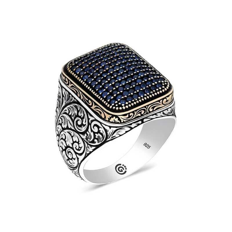 Gümüş Lacivert Zirkon Taşlı Kare Erkek Yüzük