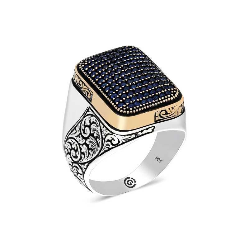 Gümüş Lacivert Zirkon Taşlı Kare Erkek Yüzük