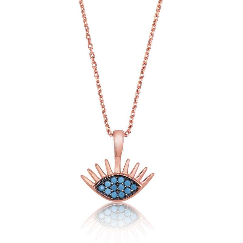 Her dönem sevilen ve şıklığından ödün vermeyen bu modeli; doğum günü hediyesi, sevgililer günü hediyesi veya annelere hediye olarak özel günlerde tercih edebilirsiniz. Mavi göz bayan kolye, 925 ayar gümüşten imal edilmiştir. Gümüş kolye üzerine rose altın kaplama yapılmıştır. Rose altın kaplama yapılan bayan kolyeler parlaklığını uzun süre muhafaza eder, gümüş rengini pembe renge dönüştürür ve oksitlenmeyi geciktirir. Zincir boyu ortalama 45 cm\"dir. Kolye üzerinde bulunan taşlar firuze renkli zirkondur. Tüm gümüş bayan kolye modellerinde olduğu gibi bu gümüş mavi göz bayan kolye modeli de tamamen el emeği ile üretilmiştir. Gümüş ve değerli taşlar nedeniyle belirtilen ortalama ürün ağırlığında ± %10 sapma olabilmektedir.