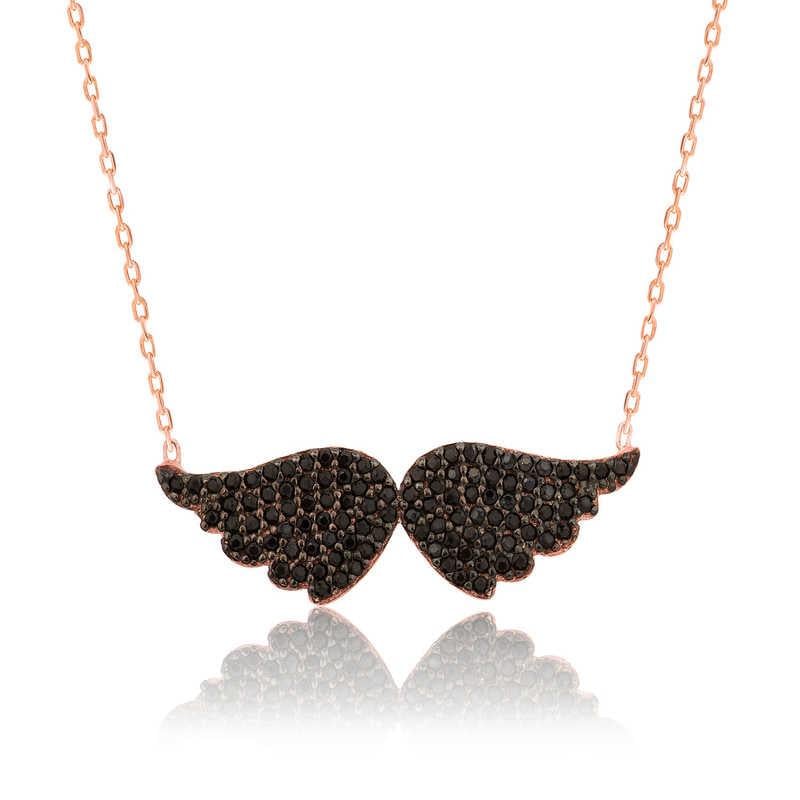 Melekler saflığın ve temizliğin simgeleridir. Bu nedenle melek kolyesi hediye edilen kişiye melek kadar saf ve temiz olduğu mesajı verilmektedir... Bu özel melek kanadı tasarımı da 925 ayar gümüşten imal edilmiştir... Tasarım melek kanadı bayan kolye üzerinde bulunan taşlar zirkondur. Kolyenin zincir uzunluğu 45 cm’dir. Zinciri de gümüşten üretilmiştir. Bu bayan gümüş kolye üzerine rose kaplama yapılmıştır. Rose kaplama yapılan ürünler parlaklığını uzun süre muhafaza eder, gümüş rengini pembe renge dönüştürür ve oksitlenmeyi geciktirir. Tüm gümüş kolye modellerimizde olduğu gibi bu gümüş melek kanadı bayan kolye modelimiz de el emeği ile üretilmiştir. Gümüş ve değerli taşlar nedeniyle ürün ağırlığında ± %10 sapma olabilmektedir.