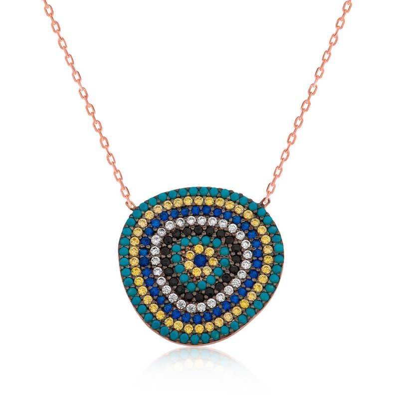 Nazar boncuğunu insanlar uzun yıllardan beri kötü bakıştan korunmak için kullanmışlardır. Kötü bakışların insanlar üzerinde olumsuz etki oluşturmasına karşı bir önlemdir nazar boncuğu. Bu sebeptendir ki insanlar sevdiklerini korumak için nazar boncuğu takmaktadır. Bu nazar kolye de şıklığı ve zarafeti yansıtıyor. Her dönem sevilen ve şıklığından ödün vermeyen bu modeli; doğum günü hediyesi, sevgililer günü hediyesi veya annelere hediye olarak özel günlerde tercih edebilirsiniz. Gümüş nazar bayan kolye, 925 ayar gümüşten imal edilmiştir. Gümüş kolye üzerine rose kaplama yapılmıştır. Rose kaplama yapılan bayan kolyeler parlaklığını uzun süre muhafaza eder, gümüş rengini pembe renge dönüştürür ve oksitlenmeyi geciktirir. Zincir boyu ortalama 45 cm\"dir. Tüm gümüş bayan kolye modellerinde olduğu gibi bu gümüş nazar bayan kolye modeli de tamamı el emeği ile üretilmiştir. Gümüş ve değerli taşlar nedeniyle belirtilen ortalama ürün ağırlığında ± %10 sapma olabilmektedir.