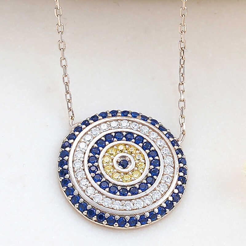 Birçok kültürde kötü enerjinin zararlarından korunmak için çeşitli tılsımlar kullanılmıştır. Doğu kültürlerinin çoğunda kullanılan tılsım ise gözdür. Nazar boncuğu da göz şeklinden ilhamla tasarlanmıştır. Mavi rengin seçilmesi de tesadüf değildir. Renkli gözlü kişilerin enerjisini daha etkili yansıttığı inancı gereği nazar boncukları çoğunlukla mavi olarak tasarlanır. Güzelliğiyle göz kamaştıran, nazardan korunmasını istediğiniz kişilere ve sevdiklerinize nazar kolyeyi armağan edebilirsiniz. Nazar kadın kolye modeli 925 ayar gümüşten imal edilmiştir. Gümüş üzerine rodyum kaplama yapılmıştır. Rodyum kaplama yapılan gümüş nazar kolye modelleri parlaklığını uzun süre muhafaza eder ve oksitlenmesi gecikir. Kolye üzerinde bulunan taşlar zirkon"dur. Bu nazar kadın kolye modeli diğer tüm gümüş kadın kolye modellerinde olduğu gibi el emeği ile üretilmiştir. Gümüş ve değerli taşlar nedeniyle belirtilen ortalama ürün ağırlığında ± %10 sapma olabilmektedir.