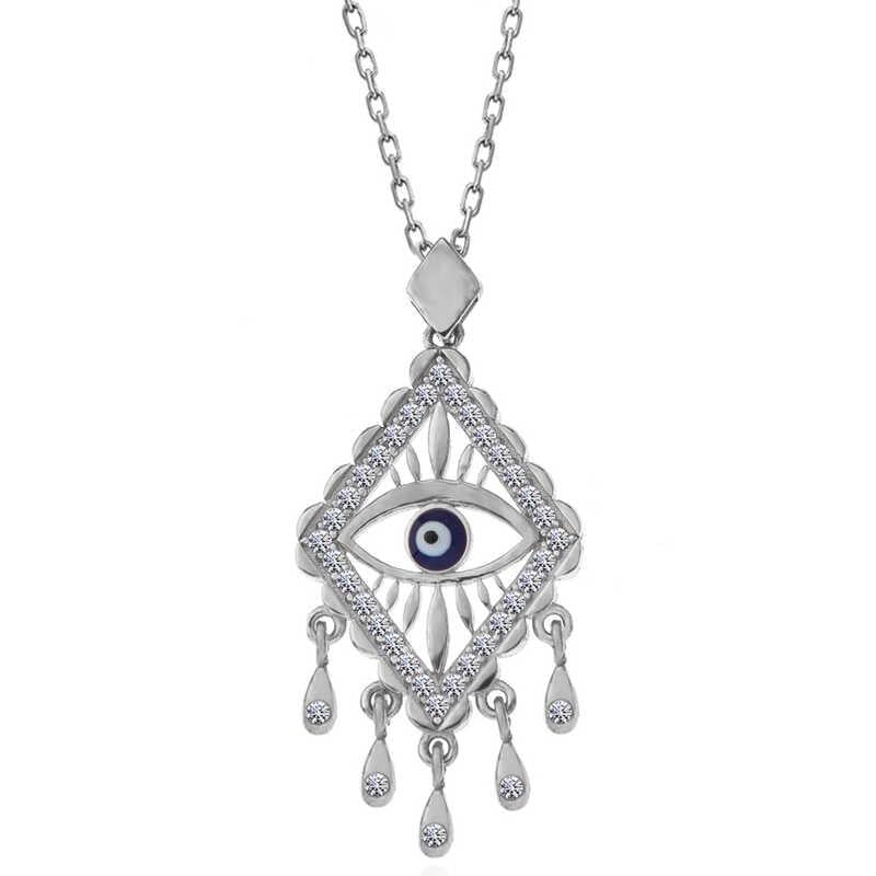 Birçok kültürde kötü enerjinin zararlarından korunmak için çeşitli tılsımlar kullanılmıştır. Doğu kültürlerinin çoğunda kullanılan tılsım ise gözdür. Nazar boncuğu da göz şeklinden ilham alınarak tasarlanmıştır. Mavi rengin seçilmesi de tesadüf değildir. Renkli gözlü kişilerin enerjisini daha etkili yansıttığı inancı gereği nazar boncukları çoğunlukla mavi olarak tasarlanır. Güzelliğiyle göz kamaştıran, nazardan korunmasını istediğiniz kişilere ve sevdiklerinize gümüş nazarlı göz kolyeyi armağan edebilirsiniz. Gümüş kolye üzerinde rodyum kaplama yapılmıştır. Rodyum kaplama yapılan gümüş kadın kolyeler parlaklığını uzun süre muhafaza eder, oksitlenmesi gecikir. Gümüş olan zincir boyu ortalama 45 cm\"dir. Ürünlerimizin tamamı el emeği ile üretilmiştir. Gümüş ve değerli taşlar nedeniyle ürün ağırlığında ± %10 sapma olabilmektedir.