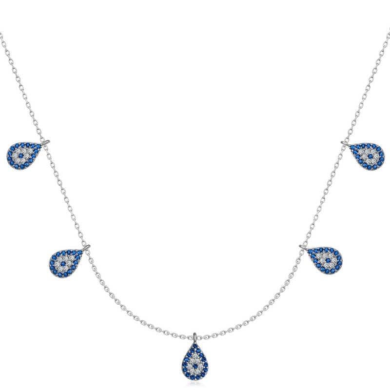 Gümüş nazar boncuğu sade tasarımıyla günlük hayatta rahatlıkla kullanabileceğiniz bir model. Nazar boncuğu sizi kem gözlerden alıkoyar. Bu şık gümüş kolye modeli üzerinde bulunan taşlar zirkondur. Gümüşün üzerine oksitlenmesi geciksin ve parlaklığını uzun süre muhafaza etsin diye rodyum kaplama yapılmıştır. Tamamen gümüş olan zincir uzunluğu ortalama 45 cm’dir. Bu nazarlı şans kolye modeli el emeği ile üretilmiştir. Gümüş ve değerli taşlar nedeniyle belirtilen ortalama ürün ağırlığında ± %10 sapma olabilmektedir.