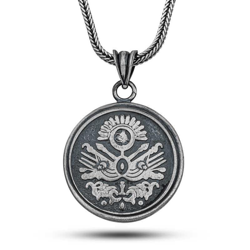 Osmanlı Devleti\"nin arması ve motifleri, tarih boyunca egemenlik, koruma ve güç sembolü olmuştur. Bu kolye, Osmanlı\"nın ihtişamını ve kültürel mirasını yansıtarak taşıyana şans ve koruma getirdiğine inanılır. Ayrıca, Osmanlı motifleri ve sembolleri, sadakat, güç ve geçerliliğin simgeleri olarak görülür.Genel olarak,bu kolye hem tarihsel bir anlatım taşır hem de taşıyana manevi güç ve koruma sağlayacağına inanılır.Osmanlı tarihi ve kültürüne ilgisi olanlar için anlamlı ve değerli bir takıdır. Gümüş üzerine oksit kaplama yapılmıştır. Oksit kaplama yapılan gümüş kolyeler parlaklığını uzun süre muhafaza eder, oksitlenmesi gecikir. Ürünlerimizin tamamı el emeği ile üretilmiştir. Gümüş ve değerli taşlar nedeniyle belirtilen ortalama ürün ağırlığında ± %10 sapma olabilmektedir.