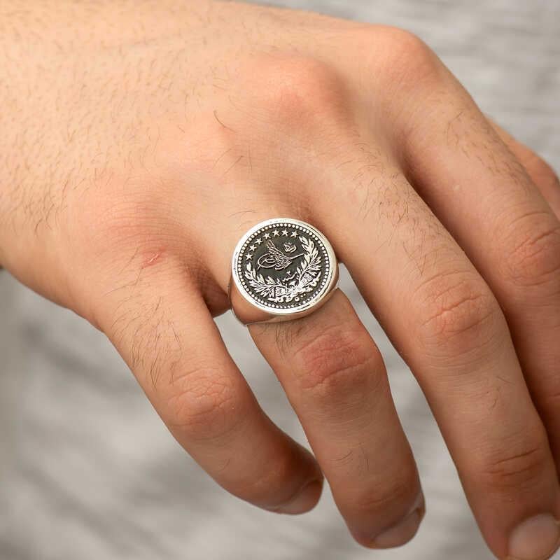 Tuğra, Osmanlı sultanlarının imzası anlamına gelir. Her tuğra; ona ait olan padişahın ismini, varlığını, hükümdarlığını ifade eder. Tuğra sembolü her padişaha göre farklı olmak üzere birçok şekilde günümüze ulaşmıştır. Tuğra; Osmanlının her döneminde korunmuş, önemini hiç kaybetmemiştir. Ve zamanla hat sanatımızda da önemli bir yere sahip olup, günümüzde hattatlar tarafından sanatsal olarak yaşatılmaktadır. Bu sanatı yansıtan gümüş yüzüğü severek kullanabilir ve sevdiklerinize hediye edebilirsiniz. Osmanlı Tuğrası Erkek Yüzük Modeli 925 ayar gümüşten imal edilmiştir. Gümüş üzerine oksit kaplama yapılmıştır. Tüm gümüş erkek yüzüklerinde olduğu gibi gümüş Osmanlı Tuğrası erkek yüzük modeli de tamamen el emeği ile üretilmiştir. Gümüş ve değerli taşlar nedeniyle belirtilen ortalama ürün ağırlığında ± %10 sapma olabilmektedir.