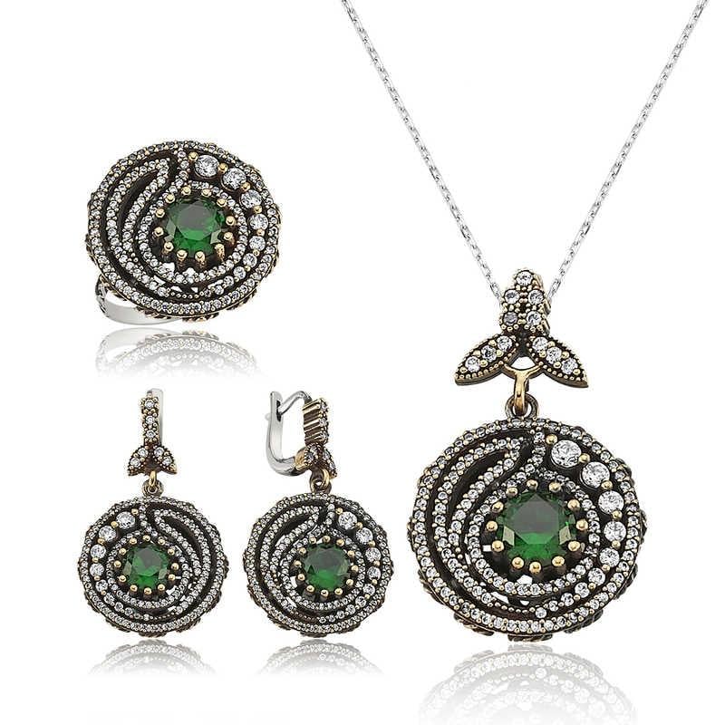 Bu şık ve her dönemde güzelliğiyle dikkat çeken otantik modelini; doğum günü hediyesi, sevgililer günü hediyesi veya annelere hediye olarak özel günlerde tercih edebilirsiniz. Gümüş otantik bayan set, 925 ayar gümüş ve bronzdan imal edilmiştir. Gümüş üzerine oksit kaplama yapılmıştır. Oksit kaplama yapılan gümüş bayan set modelleri parlaklığını uzun süre muhafaza eder, kararması gecikir. Üzerinde bulunan yeşil ve beyaz taşlar zirkondur. Tüm gümüş bayan setlerinde olduğu gibi bu gümüş otantik bayan set modeli de tamamı el emeği ile üretilmiştir. Gümüş ve değerli taşlar nedeniyle belirtilen ortalama ürün ağırlığında ± %10 sapma olabilmektedir.