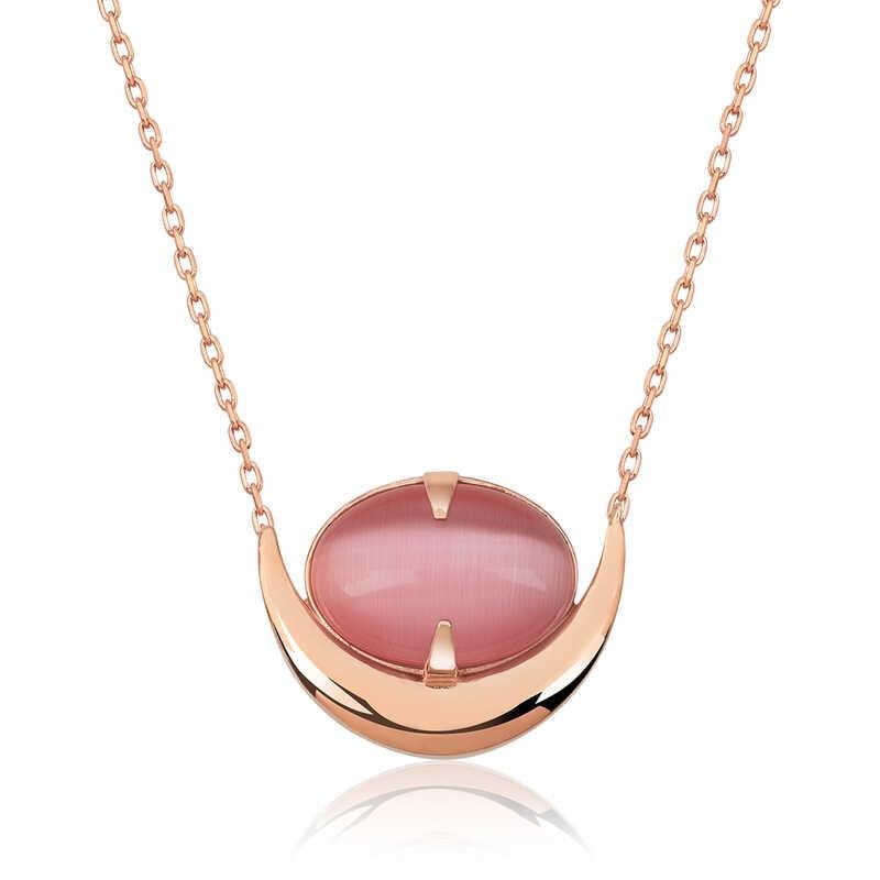 Gümüş Pembe Kedi Gözü Taşlı Hilal Kolye